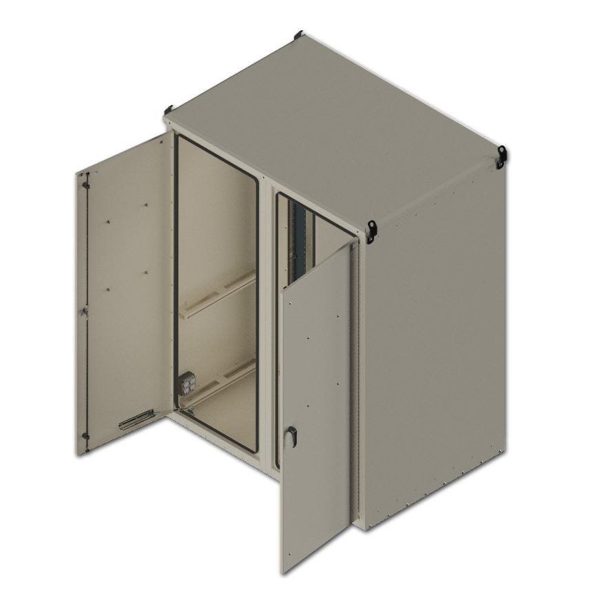 Constructed out of .125 Aluminum, powder coat Beige in color, front & rear access door with 3pt S/S pad-lockable door latches, S/S door hinges, S/S door wind guard brackets and ground strap, door bulb gasket seal, one set of adjustable 19″/23″ equipment rails per bay (42RU per bay 84RU total), solar shield, and S/S 12 ga lifting brackets.