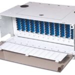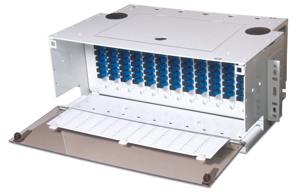 It allows one location for pre-terminated cables or direct termination of up to 288 fibers, depending on the adapter configuration. It also has internal cable routing guides that make it easy to handle entrance cable. And, there’s a port identification card attached to the front door for quick reference.