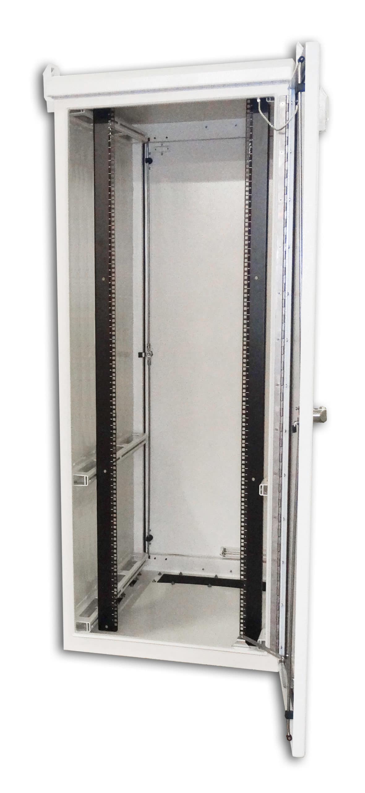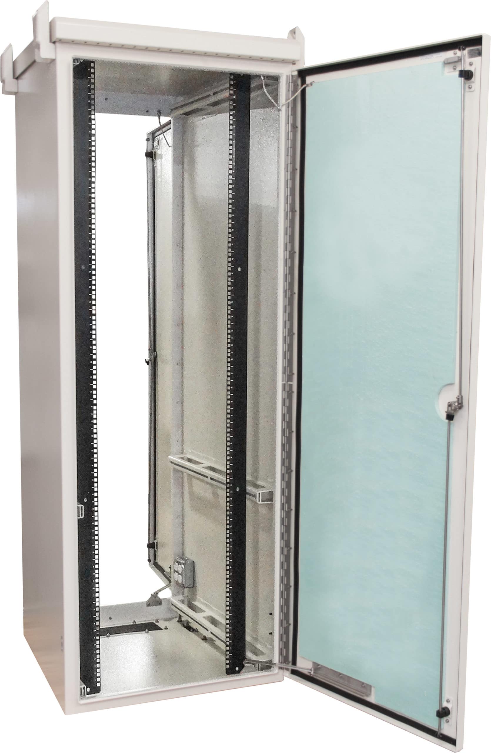 The interior provides standard rack units (RU) for installing shelving, a grounding terminal to protect against electrical surges, a solar shield roof and powered receptacles.