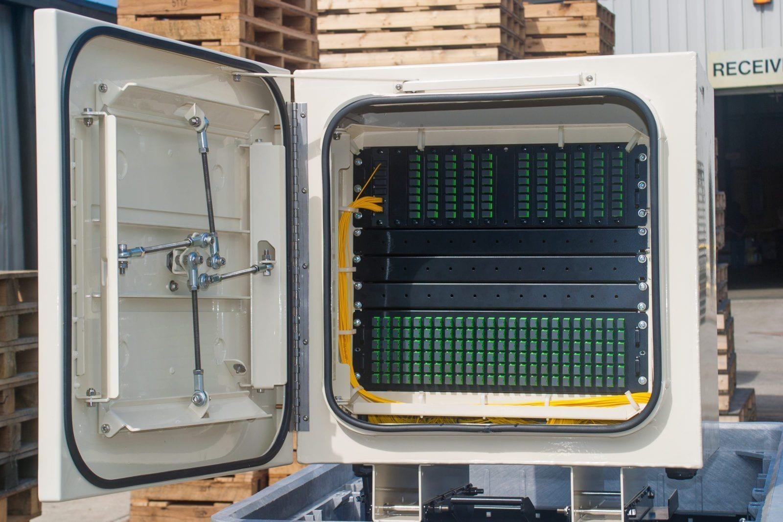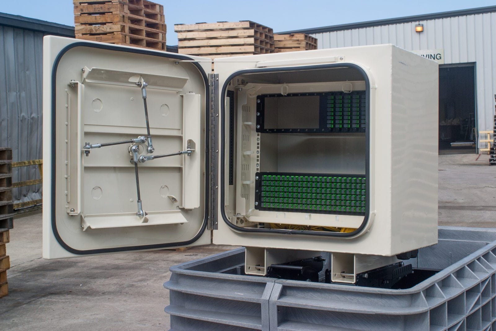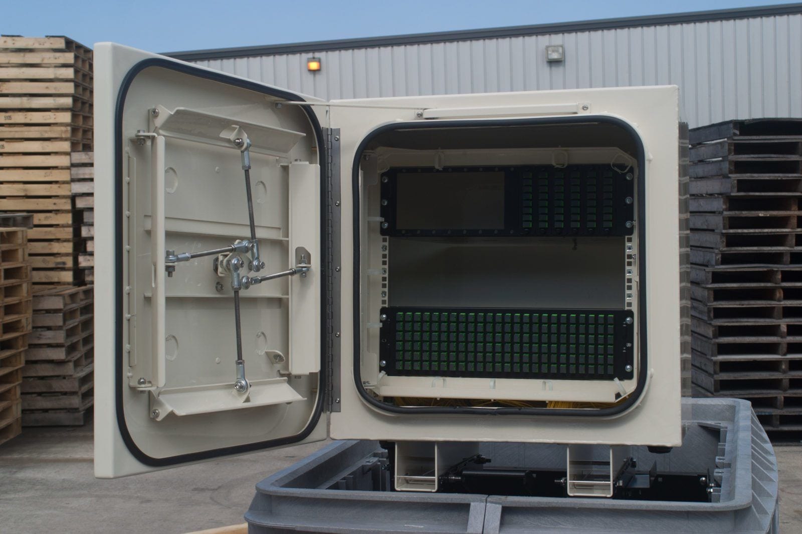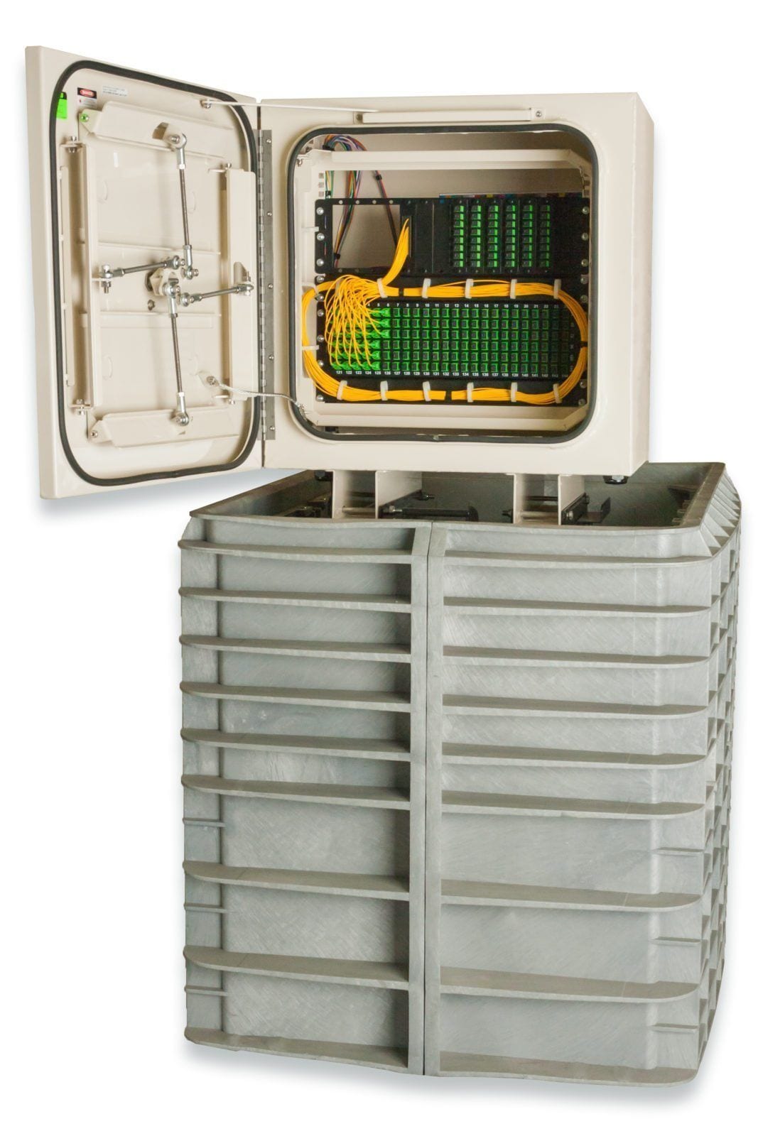This FDH will house outside plant (OSP) fiber and provides connectivity for up to 288 fiber counts. Its single-handle latching design makes it user friendly and helps ensure that the unit is sealed every time. This integrated solution also includes a mounting frame, providing easy access to the enclosure with lift assist.